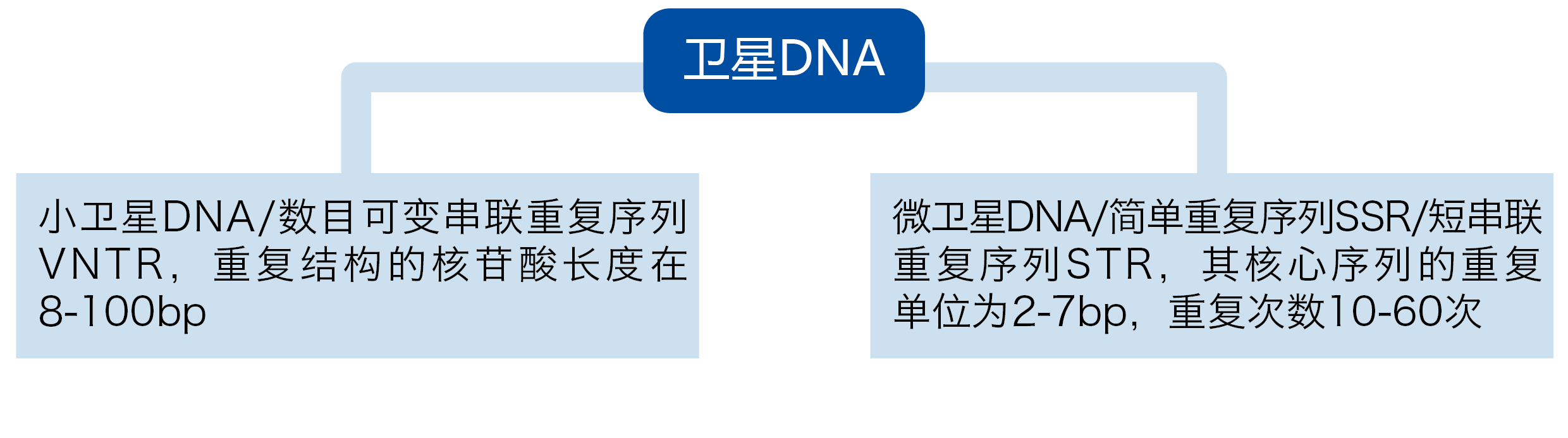 科学家们发现在人类基因组中分布着许多重复的DNA序列,这些序列大多位于基因与基因之间,因此它们在不同个体间的序列长度虽然不尽相同,但是不会影响个体间遗传功能的改变。这些高度重复的核苷酸序列DNA通常被称为卫星DNA。