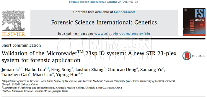 我们或多或少可能都会接触一些试剂盒验证的项目及任务。可不要小瞧验证实验,如果严格地对一款试剂盒实行各项验证实验,其数据是可以发表在法医学顶级期刊的!比如万象城AWC基因的Microreader™ 23sp ID System 试剂盒,验证实验由华西医学院侯一平老师独立进行,验证结果发表于法医学顶级期刊FSI:Genetics (图1)。验证工作的重要性可窥一斑。