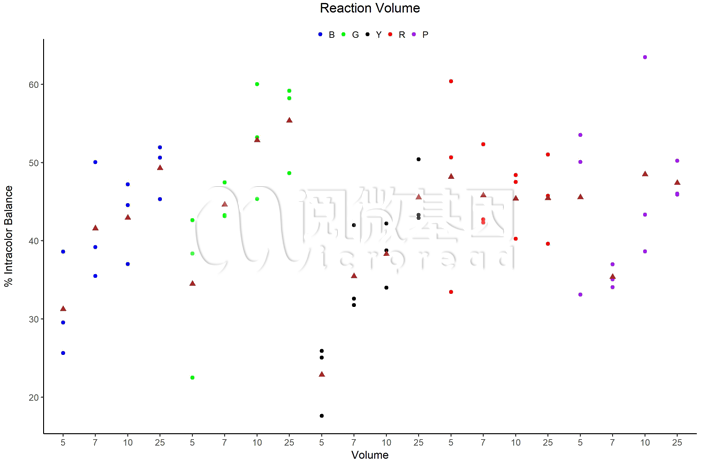 X轴代表峰高均衡性,Y轴代表各染料组不同的反应体积