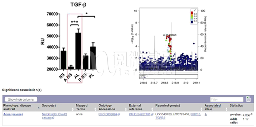 上左图,痤疮患者非病灶(A NS)和病灶(AL)组织中TGF-β的RNA表达量[2];上右图,TGF-β编码基因附近30Kb 左右的SNP位点rs1159268在重度痤疮病人中,A基因型频率显著增加[3];下图,GWAS研究将 rs11569268位点多态性与痤疮(acne)关联。(表格来源:ensembl)