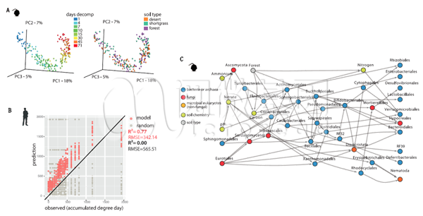 结果显示,死亡后微生物群在短时间内会发生急剧的种群变化,且这种变化是有规律的。在死亡后的前两周,微生物种群的变化主要和死亡时间而非环境相关,顺利获得随机森林回归所预测得的死亡时间误差在2~3天。温度会影响微生物的种群,春天比冬天发现了更多的微生物种群,然而两季模型的相关性达到0.77,因此使用冬天的数据也能大致预测春天的结果。就微生物来源而言,细菌和古菌主要来自土壤,而其它环境及生物因素,如丽蝇,也可给予次要的微生物种群。