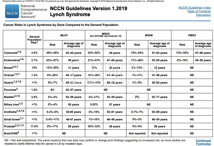 Lynch综合征的定义仍在不断开展,即使修订后的Bethesda指南与家族史不完全匹配,一个人仍可能患有Lynch综合征。NCCN指南建议所有的结直肠癌病人都行MMR或MSI筛查。