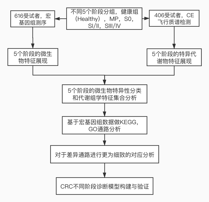 结直肠癌可分为遗传性结直肠癌和散发性结直肠癌,在散发性结直肠癌的发生过程中,会先形成息肉样腺瘤,然后开展成为粘膜内癌,最终成为恶性肿瘤。本研究对千余名健康人和不同阶段的结直肠癌患者进行研究,利用宏基因组和代谢组检测的方法,以探究粪便微生物和代谢产物在不同结直肠癌开展阶段性特异表型,筛找出疾病标志物,为CRC开展阶段的诊断治疗奠定理论基础。