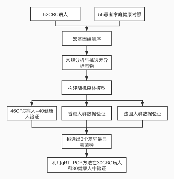 研究内容:顺利获得比较健康家庭患者的粪便菌群,建立结直肠癌的高精度生物标志物