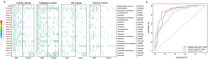 顺利获得对宏基因组的数据分析,挑选了22个和CRC显著相关的微生物功能基因,其中一半基因来源于厚壁菌门。这些功能基因涉及到群体感应、短链脂肪酸代谢、基因信息处理、DNA服务与修复等。利用此22个基因构建随机森林模型,分别对验证组(46CRC,40健康人)、香港地区数据(74CRC,54健康人)和法国地区数据(53CRC,88健康人)进行验证。其中验证组、香港组、法国组的AUC值分别为0.905、0.811、0.886。