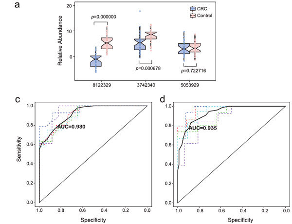 从22个基因中选取3个最具有诊断潜力基因,并设计qPCR探针,在30个CRC和30个健康人队列当中进行检测,其中2个来源于Coprobacillus和C.symbiosum的基因在CRC和健康人群中显著差异,构建随机森林模型,AUC值分别为0.930和0.935。