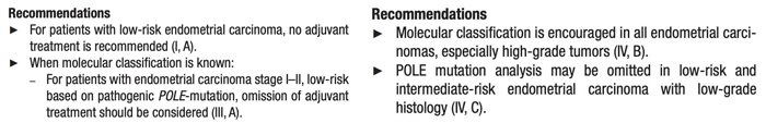 2020 ESGO/ESTEO/ESP子宫内膜癌患者管理指南推荐所有的EC患者都进行分子分型检测,尤其是高级别肿瘤。建议对于I-II期EC,对于POLE突变型,应考虑省略辅助治疗(证据等级:III;推荐等级 A)[9]。