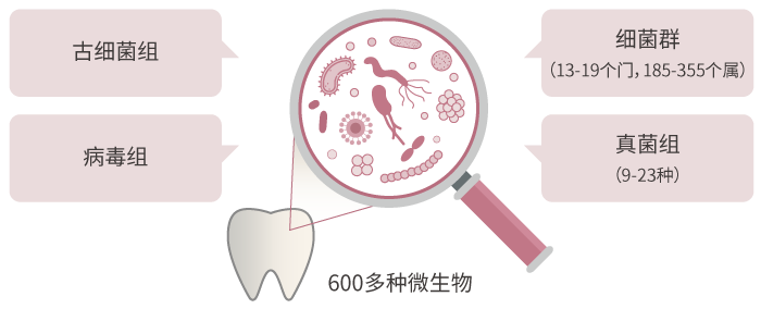 口腔微生物由600多种微生物组合而成,有真菌、细菌、病毒,甚至还有古细菌。他们附着在牙齿、舌头和口腔内壁等部位,形成了一层典型的生物膜,膜内微生物间的信号传导,影响着人类口腔乃至全身的健康状态。