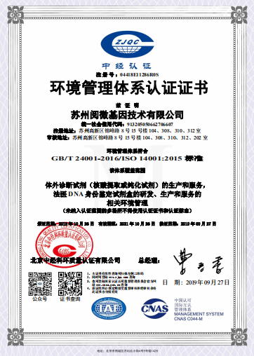 2018年10月26日苏州万象城AWC基因技术有限公司取得环境管理体系认证证书,证明环境管理体系符合GB/T 24001-2016/ISO 14001:2015标准。