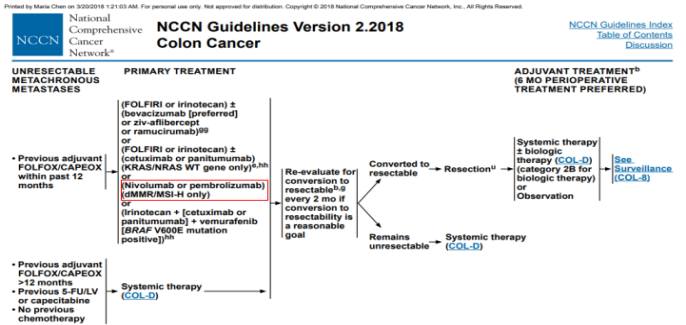 1.对于不可切除的转移性结肠癌,MSI-H/dMMR可接受纳武单抗(“O”药)或派姆单抗(“K”药)治疗;