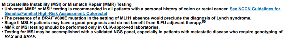 2.建议所有患有结肠癌或结肠癌史的患者进行MMR或MSI检测;