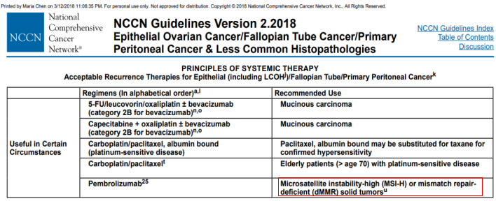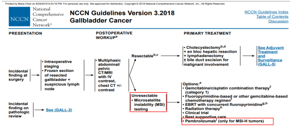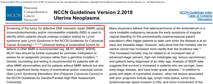 在临床实际工作上,自2017年5月FDA加速批准了PD-1抑制剂派姆单抗(Pembrolizumab,商品名Keytruda,俗称K药)应用于具有MSI-H/dMMR特征的不可切除/转移性实体瘤成人和儿童患者以来,MSI/MMR检测已经写进众多实体肿瘤2018NCCN临床实践指南中。