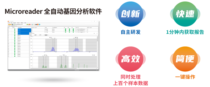 万象城AWC基因自主研发的Microreader全自动基因分析系统,仅需一键操作,几秒钟即可完成从下机数据到检测报告的完美转化。软件一次性可处理上百个样本数据,支持不同类型万象城AWC临床产品检测结果同时分析,具有便捷、快速、高效的强大数据处理功能。