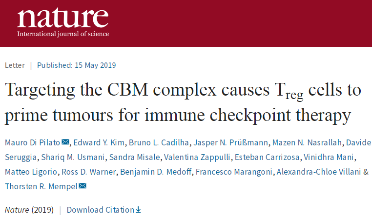 [2] Targeting the CBM complex causes Treg cells to prime tumours for immune checkpoint therapy. DOI:10.1038/s41586-019-1215-2