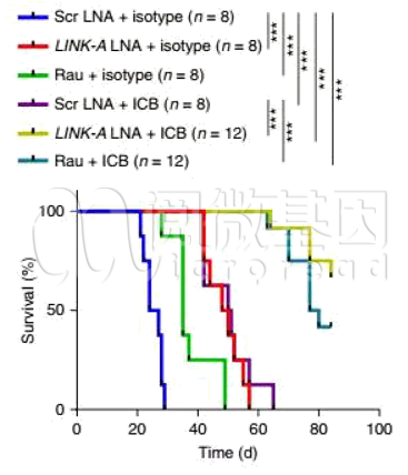 而用LINK-A抑制剂处理肿瘤小鼠,同样也观察到肿瘤中PLC蛋白含量更高,免疫细胞更多。并且,肿瘤生长受到明显抑制,肺部转移大幅减少。此外,用LINK-A抑制剂和免疫检查点抑制剂,联合治疗肿瘤小鼠,则发现能够大大提升了治疗效果,延长小鼠的生存时间,提升存活率。