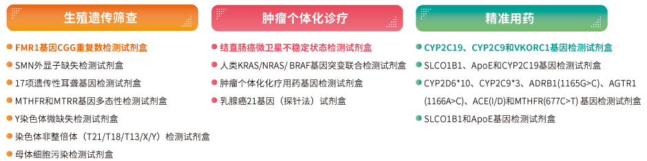*以上试剂盒仅供研究使用。结直肠癌微卫星不稳定状态检测试剂盒及CYP2C19、CYP2C9和VKORC1基因检测试剂盒现在已提交NMPA注册申请。